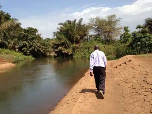 Community leader from Kahe walking along the canal a neighboring sugar cane company built to divert almost half the water produced by the local community spring for its production. Simone Lovera